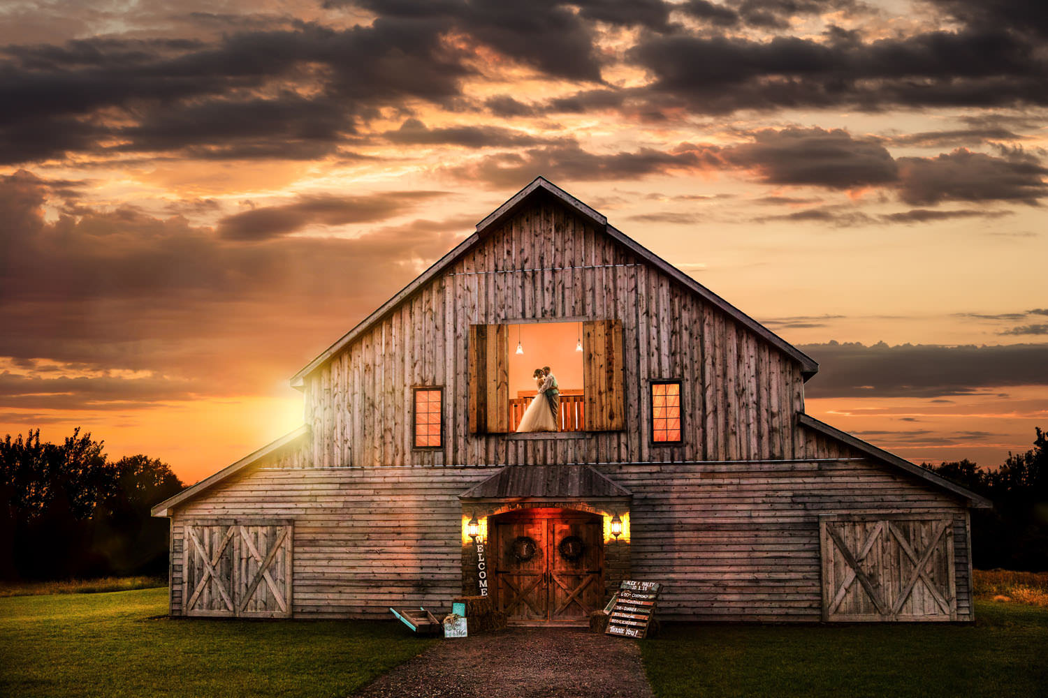 I wanted to take the barn picture right at sunset, but I knew it would be difficult. It would require lighting inside of the barn with flash, an assistant up with the couple communicating posing, and it would all have to be done rather quickly, without time for me to get test shots.