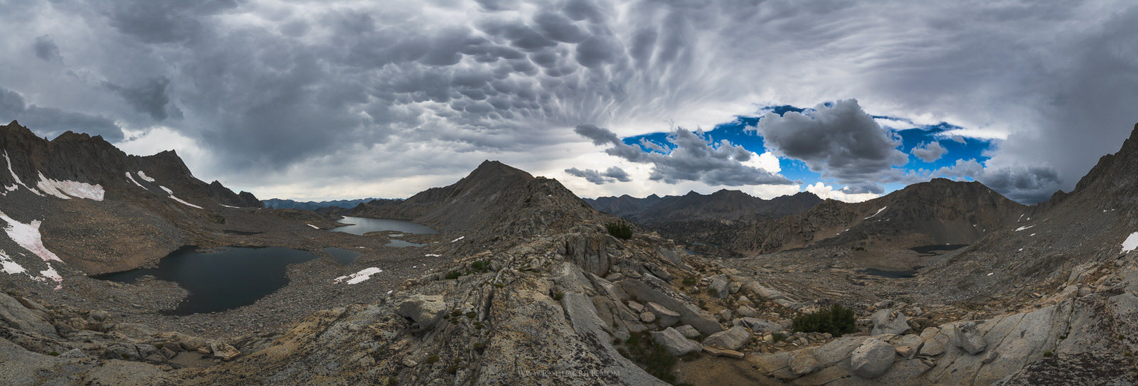 A few weeks ago, I had a five-day trip planned out to this basin. I think it’s about 15 miles to get into this basin of which maybe the last four miles are totally off-trail, not the greatest terrain, so it’s a little bit of a slog to get there. We have monsoon season here in Sierra typically in July, and the day that I was going to the basin, at about 10:30 in the morning, these big thunderheads started building up. I’m going to this off-trail area and it’s just getting darker and darker.