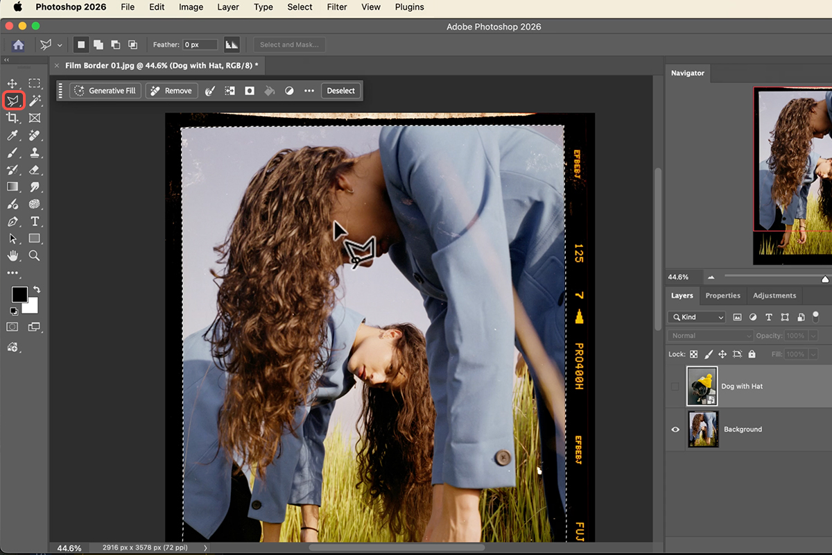 2. To make it look real, grab the Polygonal Lasso Tool (Keyboard Shortcut “L”) and click around the inside of the frame. Don’t worry about being perfect—real film is a little uneven!