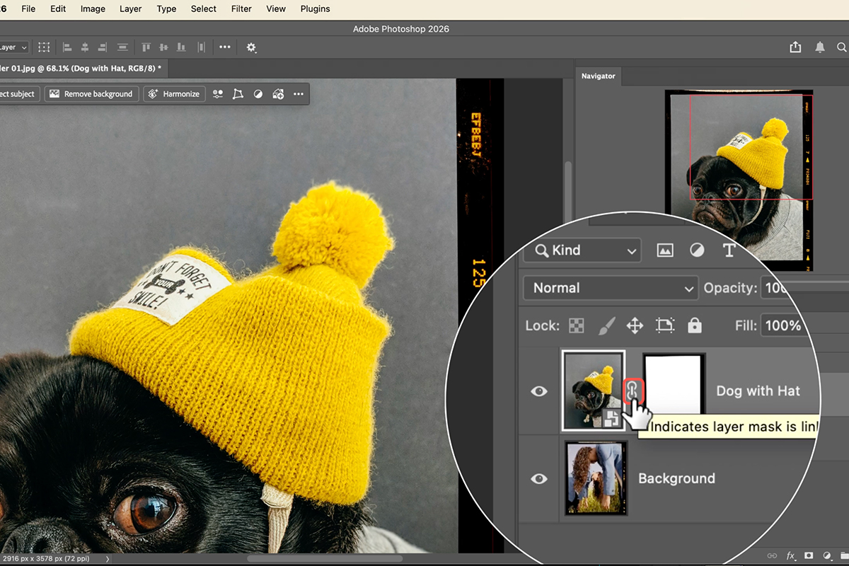 5. Look at your layers and click the small chain link icon between your photo and the mask. This unlinks them so they can move separately.