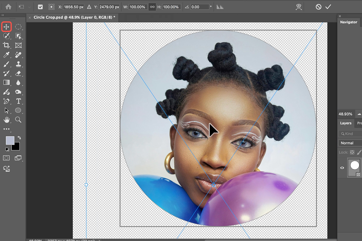 4. Use the Move Tool (Keyboard Shortcut “V”) to move your subject within the circle, or hit Ctrl/Command + T for Transform to resize or reposition the image inside the crop.