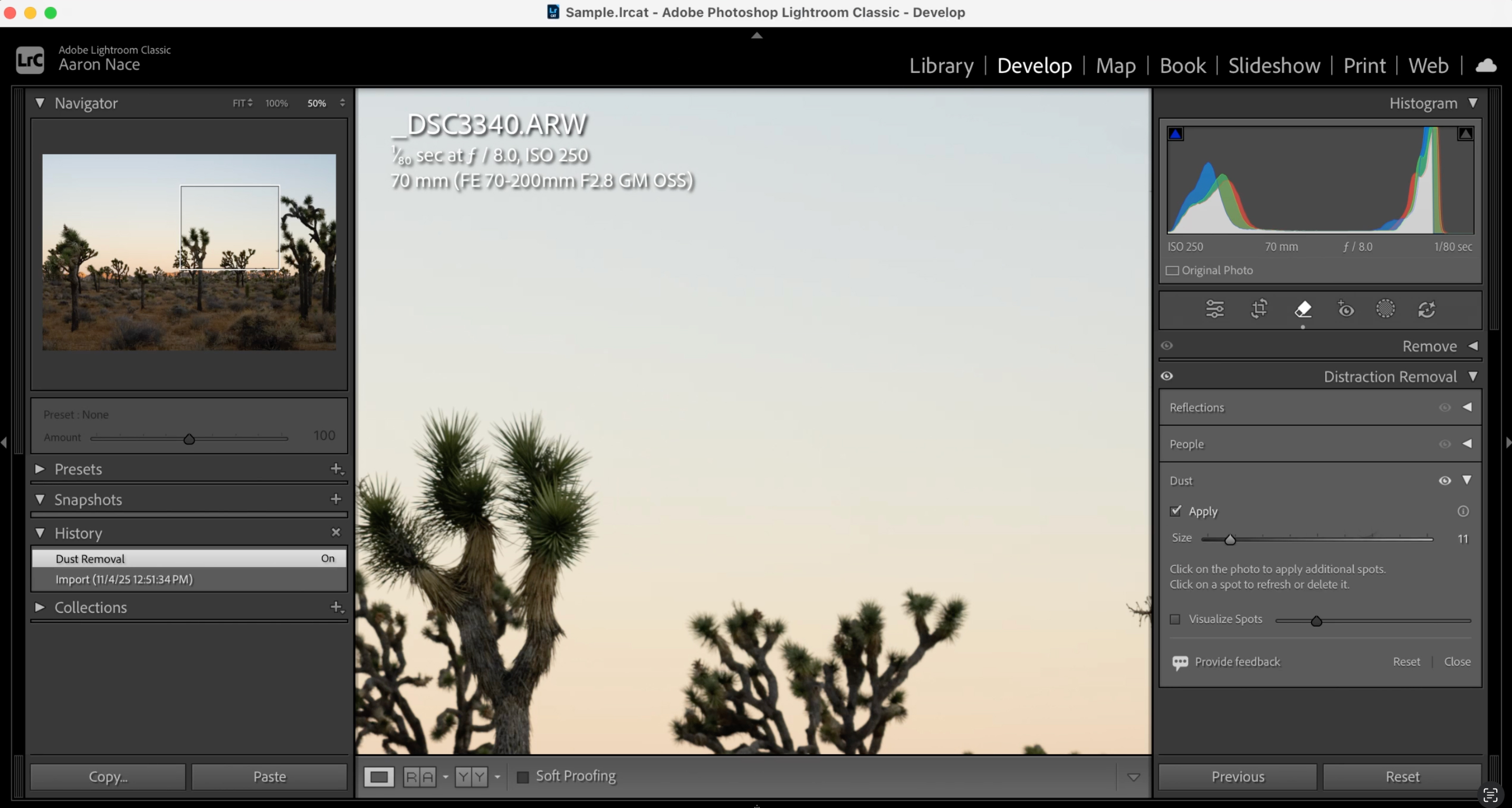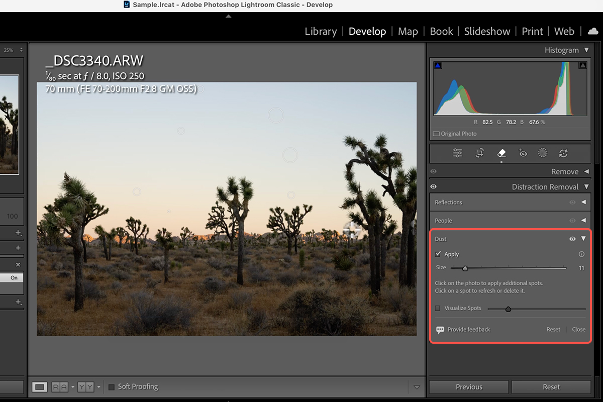 The most efficient way to clean an entire photo series is by batch-applying the dust removal setting in Lightroom Classic: