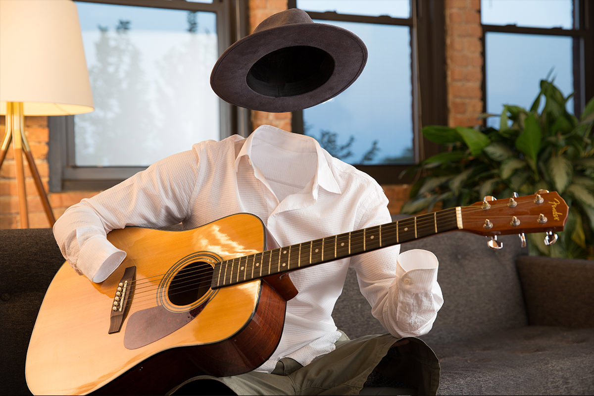 Make sure to photograph each area needed to make yourself invisible. In this case, we took individual picture of both sleeves, the collar, the guitar, the hat, and the shorts.