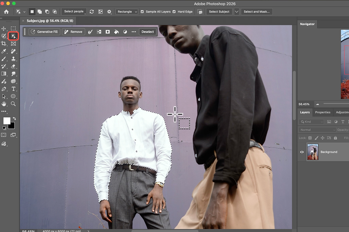 2. Use the Object Selection Tool (Keyboard Shortcut “W”) to hover over the item you wish to replace. With the new “Select People” feature, you can even isolate specific items of clothing like a coat or hat.