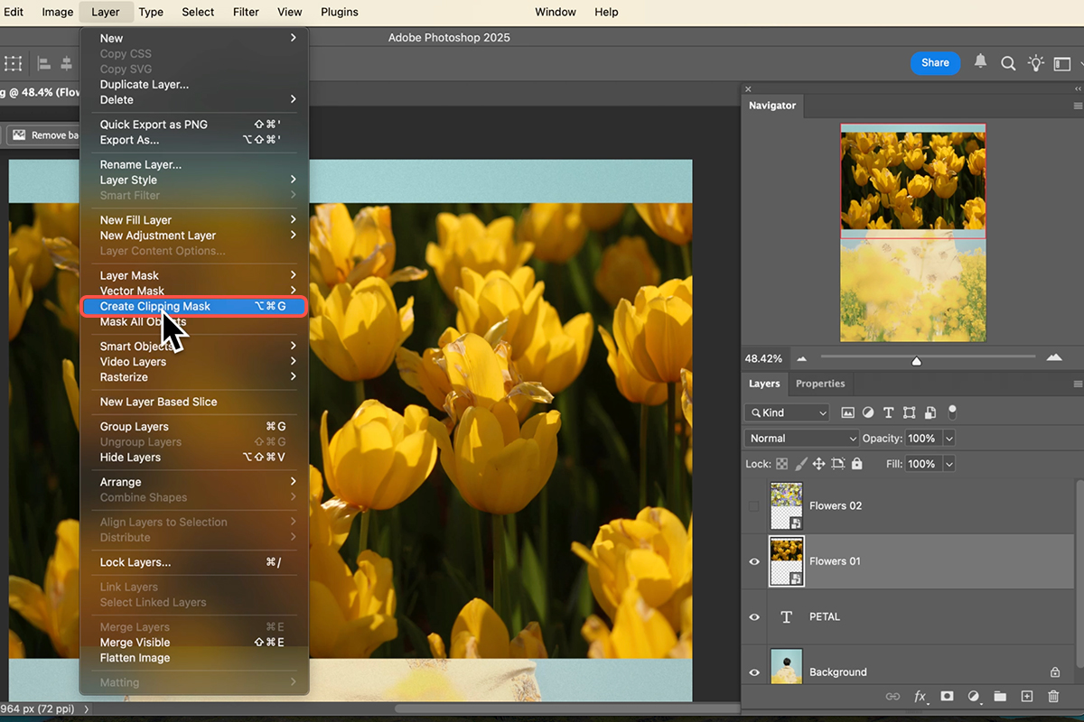 Content Change: Double-click the base text layer to change the words (for example from “petal” to “flower”). The clipping mask remains functional without any further steps.