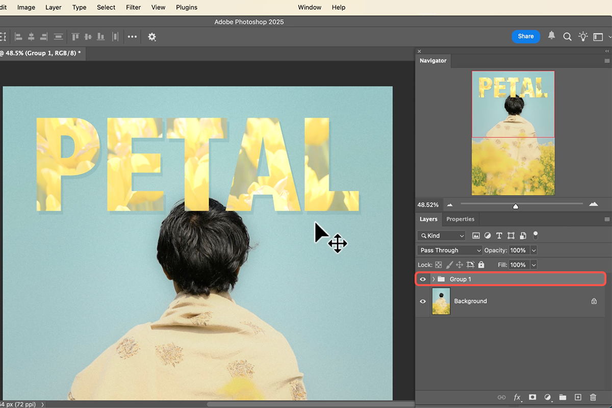 Moving: Use the Move Tool (V) to reposition the clipped image (e.g., move the flowers within the text boundary) or reposition the entire base text layer, and the clipped content will follow.