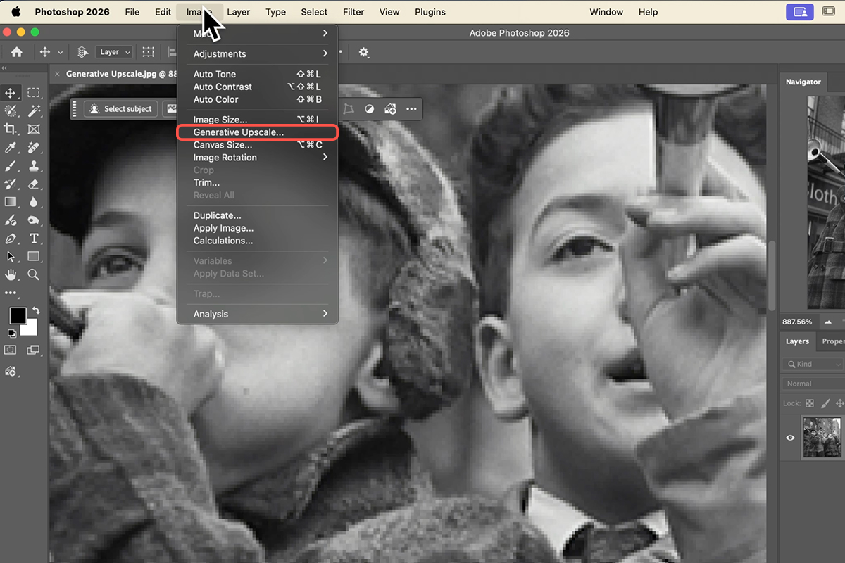 Generative Upscale in Photoshop 2026 provides a practical solution for salvaging low-resolution or vintage imagery. Older photographs often suffer from heavy pixelation and a lack of discernible detail when enlarged. By using AI to reconstruct missing data rather than simply stretching existing pixels, this tool allows for significant magnification while maintaining the visual character of the original shot.