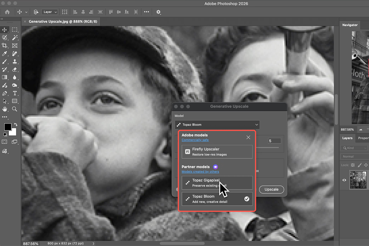 4. In the dialog box, choose your preferred model from the dropdown menu. We recommend Topaz Gigapixel for realistic detail, while the Firefly Upscaler provides standard results. Avoid Topaz Bloom for portraits as it can significantly alter the appearance of people.