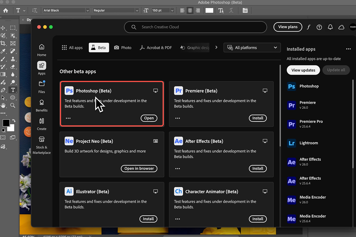 The new Dynamic Text shapes currently live in the Photoshop Beta app. To find it, open your Creative Cloud desktop application, navigate to the All Apps section, and click on the Beta apps tab. Once installed, open your project and select the Type Tool by pressing T. Click and drag to create a bounding box, then paste or type your content to get started.