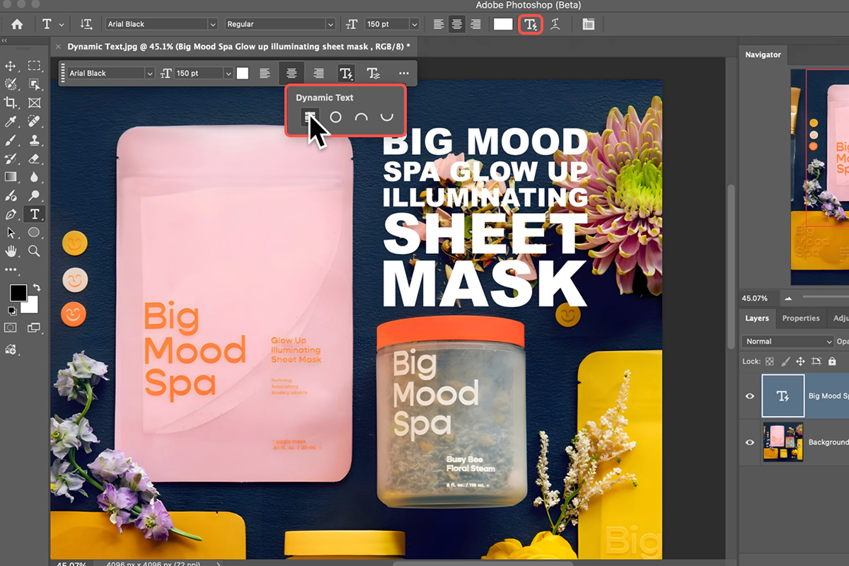 With your text layer selected, look at the Contextual Task Bar or the Options Bar at the top of your screen. Click the Dynamic Text icon (look for the lightning bolt symbol) to open the new shape menu. While the 2025 version only offered a standard block, you can now instantly select Circle, Arch, or Bow. This turns your layer into a “Smart” vector-style object that automatically adjusts font sizes to fill the space beautifully.