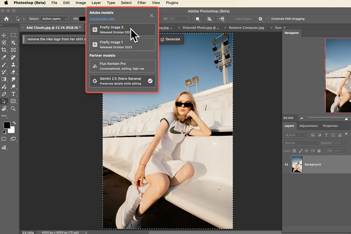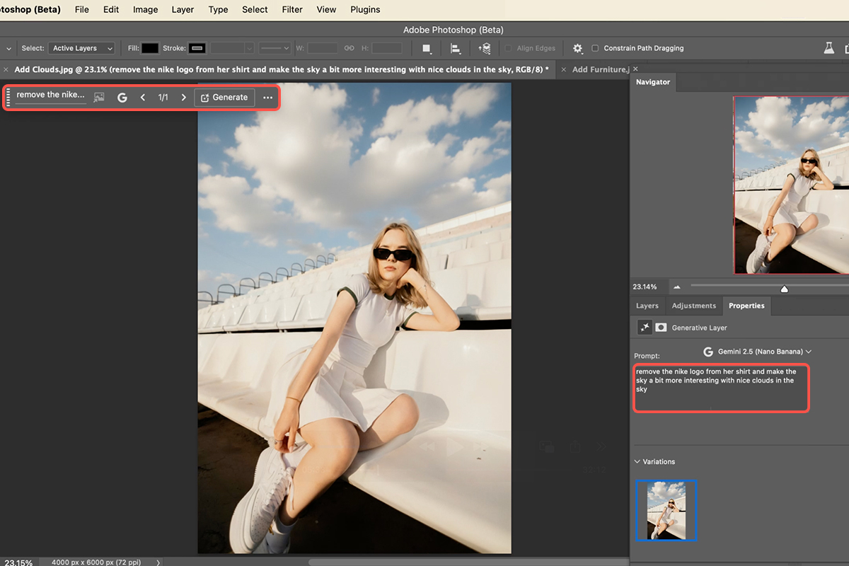 With your entire image selected, the next step is to communicate your desired changes using natural language. Access the Generative Fill feature, typically found in your contextual taskbar. This is where the “conversational editing” truly shines. Instead of issuing separate commands like “add clouds” and “remove logo,” you can combine multiple instructions into a single, descriptive prompt. For example, “remove the Nike logo from her shirt and make the sky a bit more interesting with nice clouds.” Think like you’re speaking to a human editor, detailing what you want done.